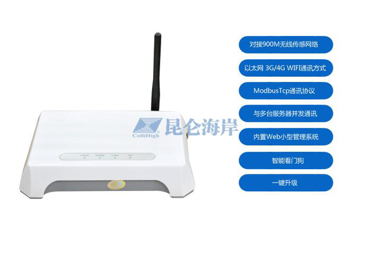 KL-H1101无线数据采集网关是北京昆仑海岸传感技术有限公司自主研发,与本公司生产的JRFW-2系列900M无线传感器配套使用的物联网网关。它提供了标准以太网接口,3G/WIFI无线接口,可以将900M无线网络连接到局域网或者互联网中,实现了互联网网络设备与900M无线传感器之间的对接。产品支持Modbus TCP协议,支持10M/100M以太网、3G、WIFI等多种互联网信息通道,方便用户通过手机、平板电脑、PC或其它移动互联网设备进行数据监测。