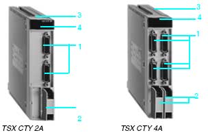 TSX CTY 2A (2 通道) 和 TSX CTY 4A (4 通道) 计数器模块的前面板包括: