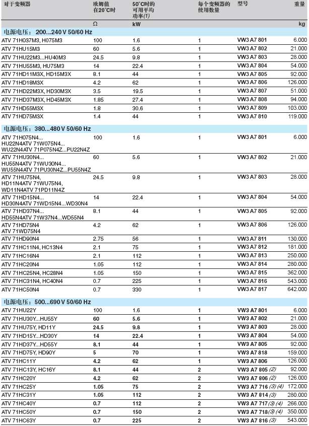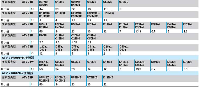 要与ATV 71变频器连接的电阻器的最小欧姆值,在20℃时ATV 71H***M3、ATV 71H***M3X、ATV 71H***N4与ATV 71H***Y变频器(2) 最小欧姆值是在温度为20℃时确定的。在温度低于20℃的环境下,一定要遵守此表中推荐的最小欧姆值。