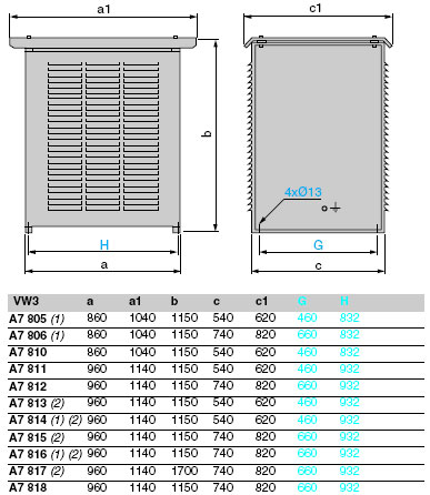 (1) 对于串联或并联安装。电阻器之间必须留有300 mm 的空隙。(2) 对于一个元件给出的尺寸。型号VW3 A7 813...815 由两个元件组成,型号VW3 A7 816 与 817 由3 个元件组成。必须考虑所有元件以决定总尺寸。每个元件之间必须留有300 mm 的空隙。